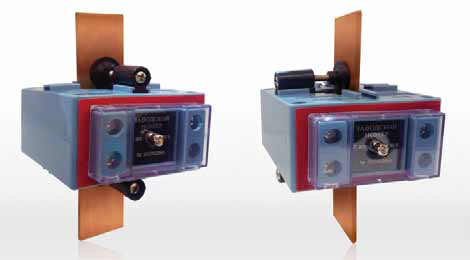 Такая вариативность установки становится возможной благодаря наличию четырех направляющих на каждой из сторон специально разработанного корпуса и универсальности резьбовой втулки с саморезом на изолирующей вставке. Направляющие расположены таким образом, что трансформатор токаможет быть повернут лицевой панелью в любую сторону относительно плоскости шины, на которой он установлен, а втулка может быть установлена в любую направляющую вне зависимости от типоразмера корпуса трансформатора.