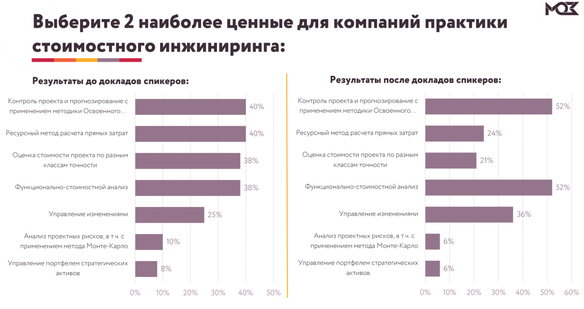 По мнению организаторов, сам Форум становится значительным инструментом влияния на то, что происходит в среде специалистов российских проектно-ориентированных предприятий. Интересным примером может служить опрос, в котором приняли участие посетители Форума в начале и в конце деловой программы. Статистика выбора наиболее ценных для компании практик стоимостного инжиниринга значительно изменилась, сместив акцент с ресурсного метода оценки затрат и оценки стоимости по классам точности в сторону применения методики освоенного объема и функционально-стоимостного анализа (см. рис.1)