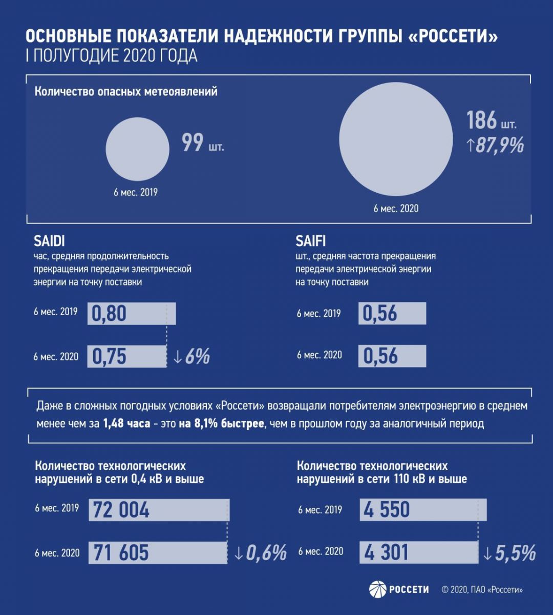 Группа компаний «Россети» продолжает снижать аварийность. Количество технологических нарушений оператора одного из крупнейших электросетевых комплексов в мире сократилось в первой половине года в сетях всех классов напряжения, в том числе на 5,5 % – на объектах 110 кВ и выше. Даже в сложных метеоусловиях снабжение потребителей восстанавливалось в среднем на 8,1 % быстрее, чем в сопоставимом периоде 2019.
