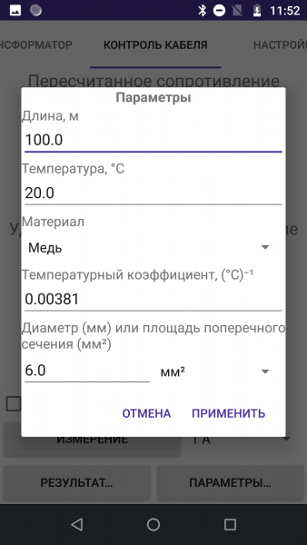 Например, у нас есть отрезок медного провода марки ПВКВ, сечением 6,0 мм2 и длиной 100 м. Нам необходимо в окне программы задать параметры измерения. Это, соответственно, длина 100 м, температура (при которой проводилось испытание) 20°C, материал изделия – медь, и, при необходимости, температурный коэффициент (для меди и алюминия задается автоматически), а также сечение – в данном случае это 6,0 мм2. Задаем параметры и нажимаем кнопку “Применить”.