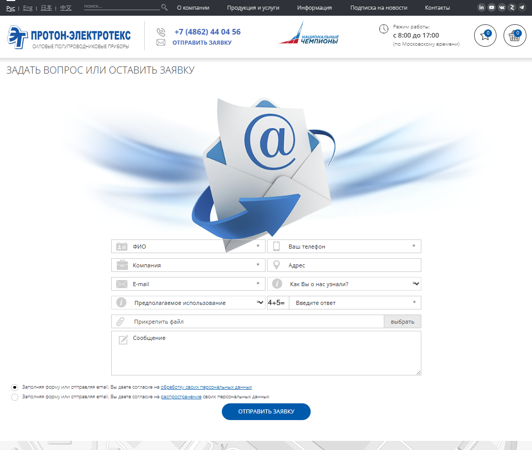 Оформить заказ клиенты могут через специальную форму из карточки товара или по ссылке на главной странице сайта. Заполненная информация автоматически попадает в CRM систему предприятия, тем самым сводя человеческий фактор к минимуму.