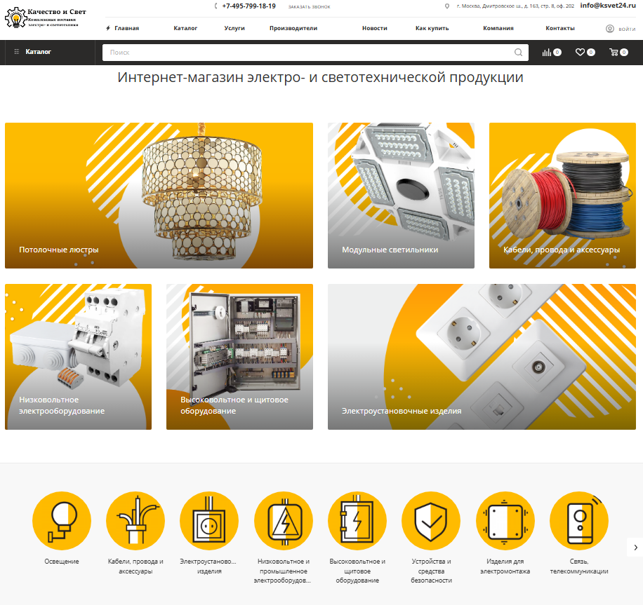 KSVET24.RU – современный мульти брендовый интернет-гипермаркет компании ООО «Качество и Свет», предлагающий покупателям огромный ассортимент электротехнической продукции, светильников для любых нужд и потребностей, электроустановочных и комплектующих изделий, инструмент, кондиционирование, вентиляцию, обогревательное и отопительное оборудование и много другого, а также комплекс услуг от компании "Качество и Свет": расчет освещенности, производство светильников под заказ, подбор продукции по заданным параметрам