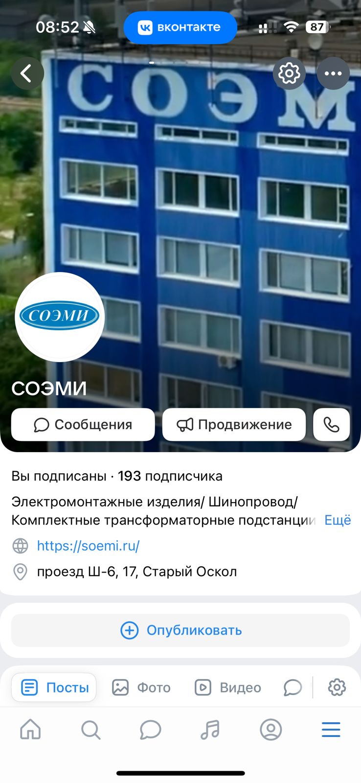Проект аккаунта ВКонтакте компании СОЭМИ представляет собой официальную цифровую площадку производителя электромонтажных изделий и кабеленесущих систем из Старого Оскола. Аккаунт отражает мощь производства и драйв больших идей, сочетая надежность сильного партнера с современными технологиями и инновациями. В рамках продвижения компания активно делится новостями о своих 45-летних достижениях, разрабатываемых национальных проектах, специализированных цифровых решениях для автоматизации проектирования (например, плагина для Autodesk Revit), а также организует вебинары и мероприятия для профессионалов проектирования и инженерии. В аккаунте доступна информация о продукции, технических решениях, возможностях завода и приглашения на экскурсии и общение с экспертами отрасли. Все это направлено на комплексное и удобное взаимодействие с государственными и коммерческими клиентами, проектировщиками, монтажниками и другими заинтересованными специалистами.