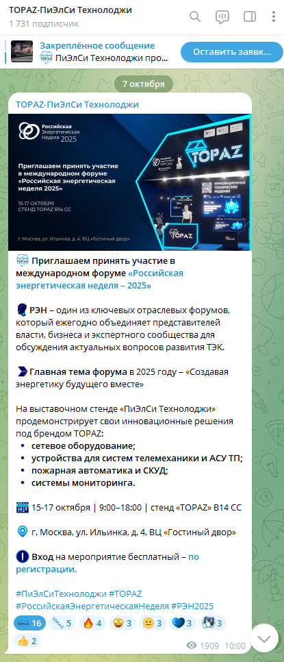 Телеграм канал https://t.me/topaz_plc_technology выполнен в виде информационного портала компании ПиЭлСи Технолоджи. В нем пользователь может ознакомиться с новостями компании, анонсами мероприятий и новинками продукции.