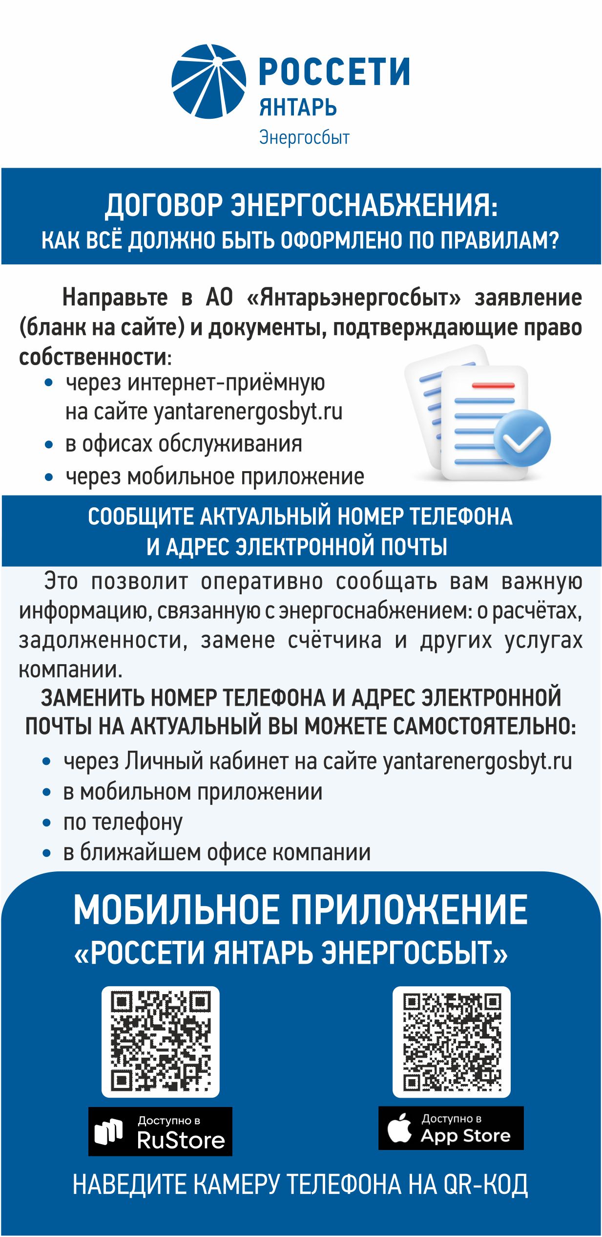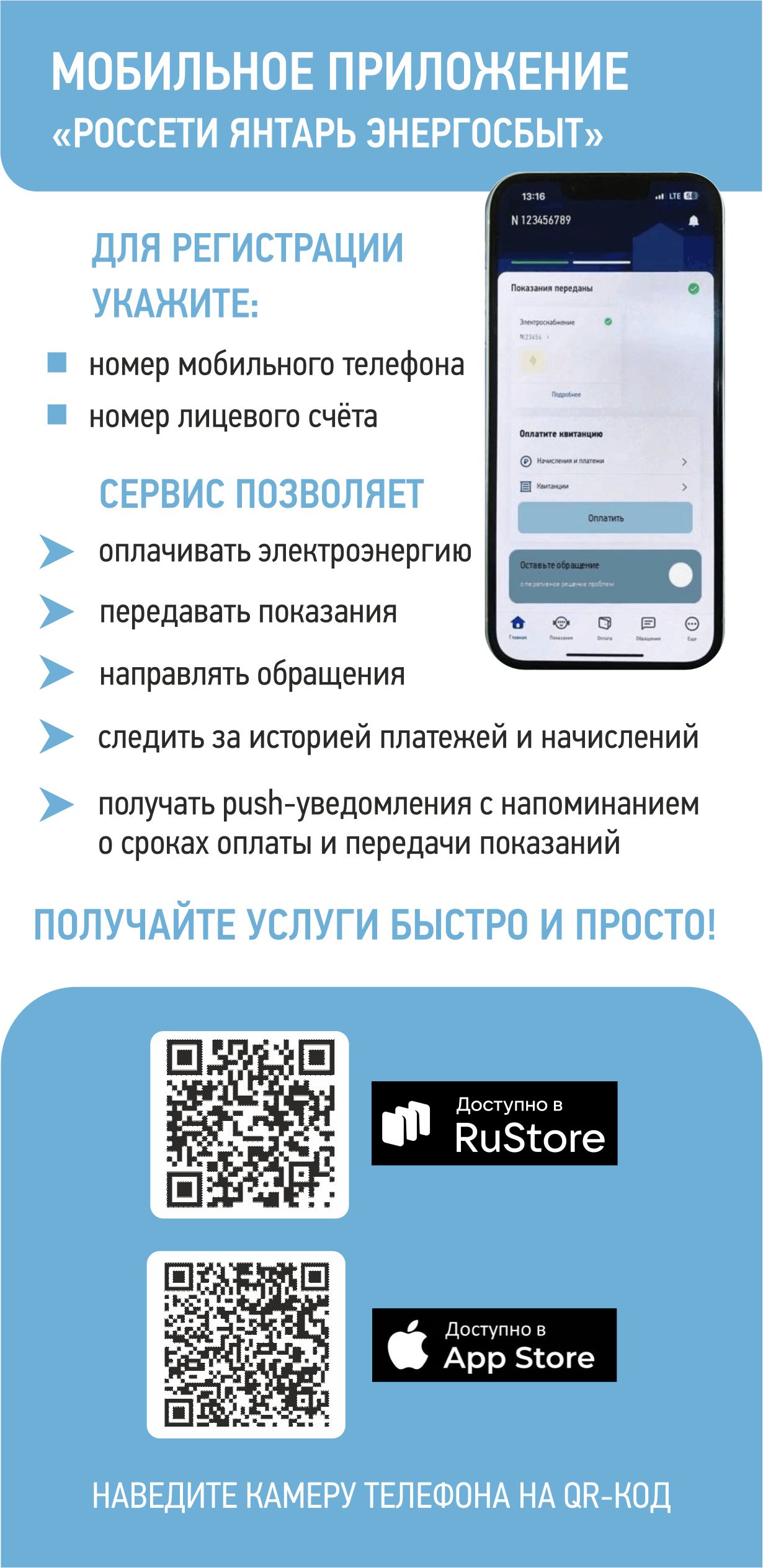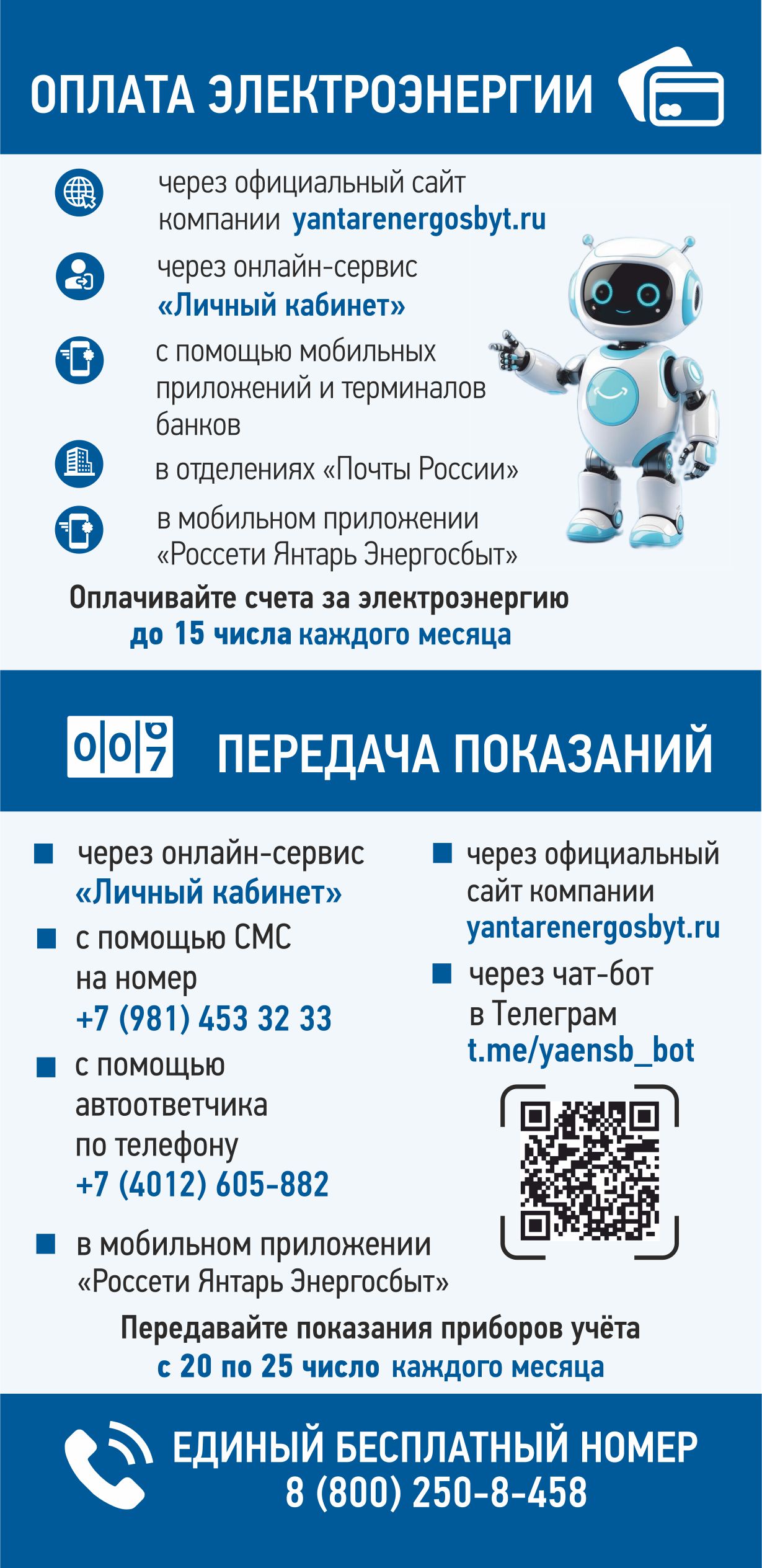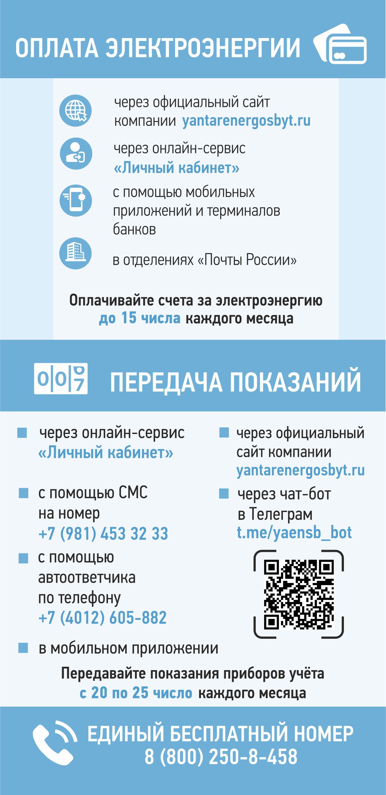 Для информирования жителей региона компания выпускает листовки, с помощью которых потребители могут познакомиться с сервисами компании, со сроками оплаты и передачи показаний. Кроме того, для удобства клиентов на флаерах размещены qr-коды для скачивания мобильного приложения и для перехода в чат-бот для передачи показаний. Листовки распространяются в офисах компании, а также вручаются потребителям в ходе рейдовой работы.